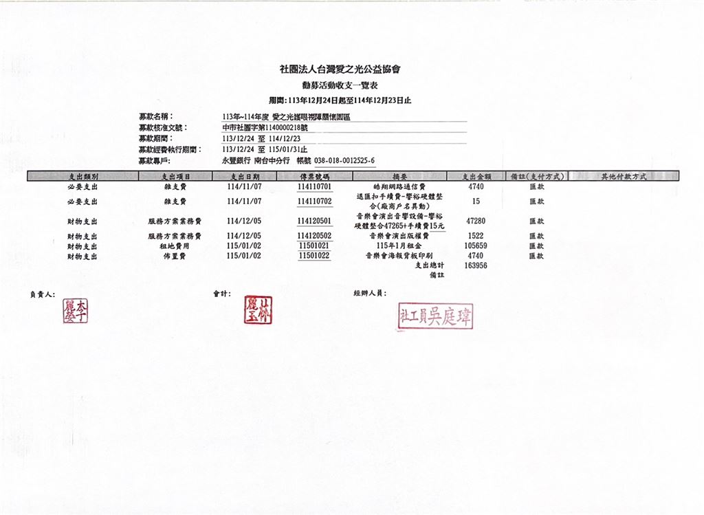 本公益勸募活動所募款項依照「愛之光 護眼視障關懷園區」公益勸募計畫之賸餘款使用計畫書已執行完畢。並於中華民國 115年 1月 3 日將其使用情形,於本協會網站公開徵信。